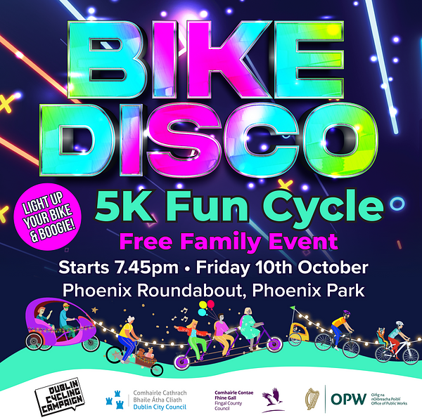 Dublin City Council, Fingal County Council and the Office of Public Works welcome the public on the 10th October to join their family-friendly, car-free 5km bike disco around the Phoenix Park.